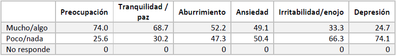 En la tabla 2, la encuesta para el país presenta las emociones más destacadas del confinamiento, ya apuntadas, y en este caso mostrando las cifras que es posible complementar con las narraciones de las entrevistas, que las significan y explican.