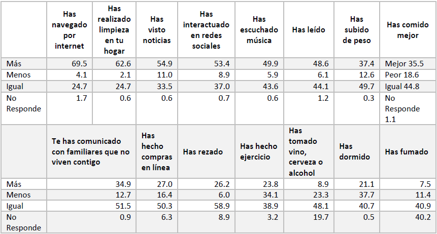 En otro nivel, pero en íntima relación con lo anterior, están los comportamientos, tanto hábitos o actividades, y las relaciones. Los cambios de rutinas, hábitos y comportamientos tuvieron lugar, ya que el aislamiento social se trata de no salir de casa y de estar todo el tiempo entre las “cuatro paredes” de la vivienda u hogar, compartiendo espacio y actividades con los miembros de la familia que conviven. En la encuesta (tabla 3) destaca el tiempo de navegación por internet, la limpieza del espacio, las noticias, las redes, la música, la lectura y también la subida de peso o no y el comer mejor o peor. Sobre el tema de internet que aparece en la encuesta, en primer lugar, algunas investigaciones exponen los problemas de adicción acrecentada en la pandemia (Prieto et ál., 2020). Si bien una recomendación de varias investigaciones apunta a la necesidad de estar conectado y tener acceso a un celular y conexión a internet como algo positivo para las personas en estrés (Brooks et ál., 2020).