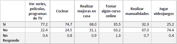 Además de los comportamientos personales y hábitos de vida cotidiana, se indaga también sobre actividades recreativas, como se observa (tabla 4), al parecer se han realizado varias actividades con objeto de ocupar el tiempo libre para las personas que lo tenían y el ver la televisión, series y películas aparece como el más común, además de cocinar, realizar mejoras en casa —como ya se vio—. En menor medida también se tomaron cursos por internet, se hicieron manualidades y ocuparon el tiempo con los videojuegos; todo esto según la encuesta para el país.