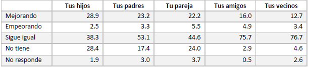 Con respecto a la relación familiar, varios testimonios de los jóvenes estudiantes giraron en torno a su mejora en general y la valoración de los padres de manera particular, no sin mostrar algunos la incomodidad de la convivencia, pero la mayoría agradecidos de poder compartir charlas y actividades, recibir apoyo económico, y sobre todo moral y psicológico. “Consciencia, acercamiento con mi familia” (hombre de 20 años); “me enseñó a ver qué tan fuerte soy, conocer más a fondo el amor de mi familia y disfrutar cada instante de la vida” (mujer de 20 años). En cuanto a la población adulta entrevistada, se mostró también contenta del mayor tiempo pasado con los hijos, y sobre todo la alegría y tranquilidad de estar con la familia sana; no obstante, también apareció en alguna ocasión el reto de la convivencia al no haber estado anteriormente tanto tiempo juntos y al haber personalidades tan diferentes. “Reencontrarnos y valorar en verdad lo que tenemos, la familia” (mujer de 54 años), “más comunicación y unión con la familia” (hombre de 30 años), “poder estar con mi hija” (mujer de 29 años).