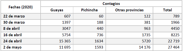 La situación de la pandemia en el puerto principal se desbordó. La evidencia demuestra cómo el número de contagios en la provincia de Guayas, donde Guayaquil es su capital, es superior a la provincia de Pichincha y su capital Quito, así como el resto del país. Los meses más críticos fueron marzo y abril de 2020. Todavía no se cuenta con un registro que pueda contabilizar la totalidad de muertes por la covid-19. Las autoridades han presumido que el incremento de fallecidos tiene relación directa con la pandemia, sobre todo para el caso de Guayaquil. En la tabla 2, se observa el número de contagios que se produjo en las dos ciudades, en los meses de estudio.