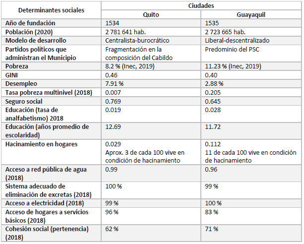 De los aspectos mencionados, se hace énfasis en tres: a) la relación que se construyó históricamente entre el Gobierno central y los municipios de Quito y Guayaquil alrededor de lo que establece la Constitución con énfasis en la competencia de salud y, con el tiempo, la descentralización; b) las implicaciones de esta relación en el modelo de desarrollo de cada ciudad y la configuración posterior del capital social; c) las condiciones de vida de la población para comprender cómo estas determinan un mejor control de la pandemia en términos de prevención, atención y contingencia. Estos tres aspectos actúan de manera interrelacionada, por tanto, abren paso al tejido de una urdimbre más amplia desde una perspectiva interdisciplinaria en la que se consideran categorías de la ciencia política, la sociología y la economía.