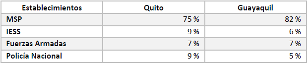 Según Torres (2019), al 2017, Ecuador contaba con una Red Pública Integral de Salud con 3059 establecimientos que se concentraron, en mayor medida, en tres de las 24 provincias: Manabí, Pichincha y Guayas, por cierto, las de mayor población y votación. En la provincia de Pichincha, se encuentra Quito. Respecto de establecimientos médicos, tiene el 75%, que son del MSP, el 9% de la Policía Nacional, el 9% de las FFAA y el 7% del Iess; mientras que, para Guayaquil, el 82% son del MSP, el 7% de las FFAA, el 6% del IESS y el 5% de la Policía Nacional. En consideración que estas cifras solo contemplan el sector público, no se puede observar el papel que desempeñan las organizaciones y fundaciones como la JBG. La distribución de establecimientos en Quito es dispersa por su topografía irregular, mientras que en Guayaquil se concentra en la zona urbana. En los casos, la accesibilidad es compleja para las personas de escasos recursos por la ubicación de los hospitales; en este sentido, hay una deficiencia en lo que se refiere a accesibilidad espacial.