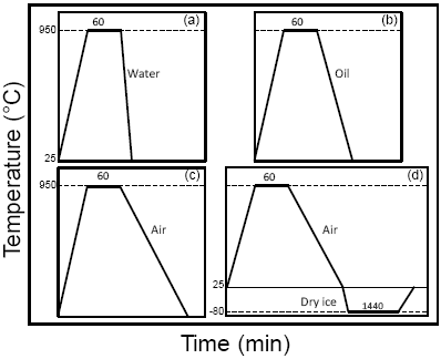 The samples were destabilized at 950 ºC and maintained at this temperature for one hour, then subjected to cooling in different media (air, water, oil [Shell Voluta C] and air, followed by immersion in compressed CO2 or dry ice). The last treatment was applied in order to observe the effects of supercooling on the wear behavior, and it implied a 24-hour immersion of the specimens in dry ice-compressed CO2, a temperature of -80 °C. Fig. 1 summarizes the thermal cycles used in this investigation.