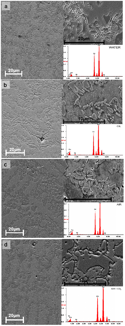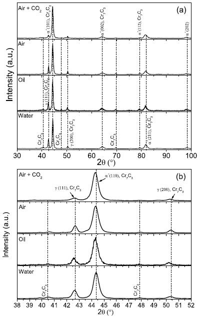 The highest values of retained austenite, determined using the ASTM method [22], were encountered for samples cooled in oil (~35.5%), followed by samples cooled in water (~28.5%) and in air (~26.2%). The lowest values, around 14.3%, were obtained for the samples cooled in air and subsequently immersed in CO2. Therefore, it was determined that the later cooling media can effectively reduce the proportion of austenite, which leads to the increment of fresh martensite content in the material, compared with the other cooling conditions, and it can also increase the fine secondary carbides precipitates, which can cause the dispersing strengthening effect.