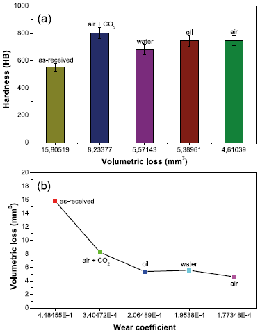 After the weight loss was determined, the values of volume loss were obtained, which are the more relevant for comparisons and calculations by using the density of the material (7700 kg / m3). A correlation between hardness and wear behavior (volumetric loss and wear coefficient) is given in Fig. 7.