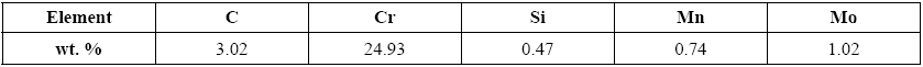 A high chromium white cast iron manufactured by a regional company was used in this investigation. The material composition is summarized in Table I.