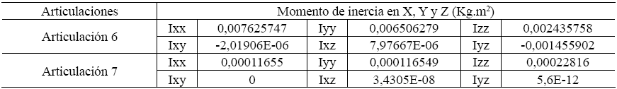 Asimismo, este entorno permite configurar el tipo de material en que se construirá el robot y agregar los ejes de rotación al diseño realizado, facilitando el cálculo de los parámetros inerciales como la masa, el volumen y el centro de masa, con el fin de hallar los momentos de inercia necesarios para el modelo dinámico del robot (Tablas 2y3).