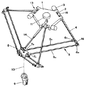 El robot Delta (Fig. 1) es un manipulador paralelo que consta de tres cadenas cinemáticas cerradas de configuración PR(Ps), donde (Ps) representa el espacio paralelogramo de cuatro barras con cuatro articulaciones esféricas, y PR representa que cada una de las cadenas cinemáticas se compone de una articulación prismática pasiva y una articulación de rotación activa que conectan una base fija de mayor tamaño a una base móvil de menor tamaño [4].