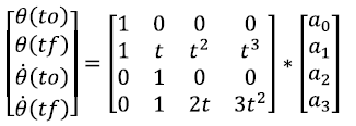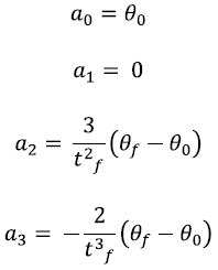 Estas restricciones satisfacen así un polinomio mínimo de grado 3 (polinomio cúbico), que será descrito para su posición, velocidad y aceleración en (7), (8) y (9), respectivamente.
