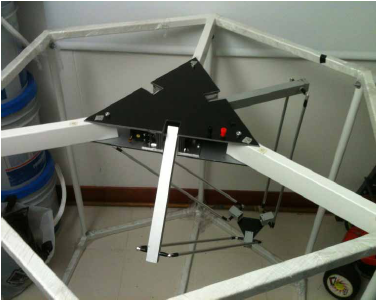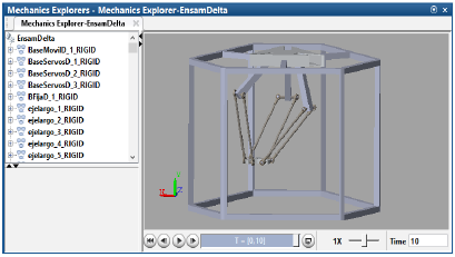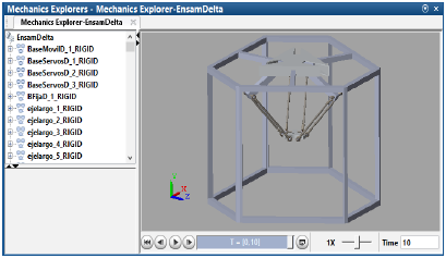El entorno virtual (Fig. 27) con el cual el usuario interactúa para simular y ejecutar una trayectoria incorpora una simulación en un entorno 3D para sistemas mecánicos, conocido como SimMechanicsTM[16], dentro del cual se corrobora el posicionamiento de los eslabones en la planeación de los puntos vía que conforman la trayectoria que se pretende ejecutar; esto con el fin de visualizar y comprender el comportamiento del robot Delta durante el seguimiento de una trayectoria, previniendo que este no entre en una configuración singular, que podría llegar a dañar seriamente el prototipo mecánico real una vez se le ordene empezar la ejecución de la trayectoria. En la Fig. 25 y Fig. 26 se observan, respectivamente, las simulaciones para el punto inicial y el punto vía 1 que componen la trayectoria2.