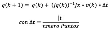 La cinemática inversa permite el cálculo de un conjunto de ángulos de articulación que corresponderá a la configuración (posición y orientación) de destino; conociendo un punto inicial y un punto final, se desea encontrar una función que para un t0 determine el valor inicial de la configuración, y para un , un valor final de la configuración.
