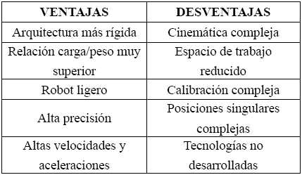 Algunas de las principales ventajas y desventajas del robot Delta, como también de muchas plataformas tipo paralelo se aprecian en la Tabla 1.