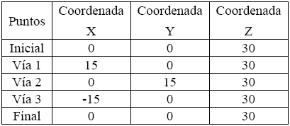 1) Trayectoria 1: La primera trayectoria por implementar se diseñará para formar un triángulo equilátero; dicha trayectoria se planeará en el plano XY, manteniendo un valor constante en la coordenada Z, ejecutándose a través de cinco puntos en total, de los cuales, tres son puntos vías y dos son los puntos inicial y final de la trayectoria. Las coordenadas de los puntos se observan en la Tabla 3.