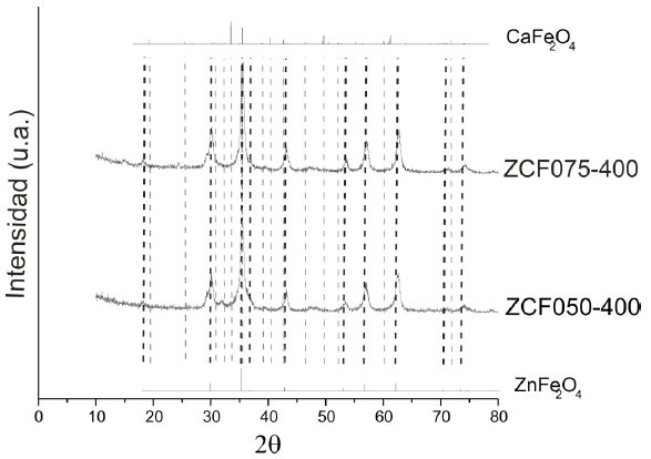 En la Fig. 1 se presentan los resultados obtenidos de los patrones de difracción de las ferritas Zn0.50Ca0.50Fe2O4 (ID: ZCF050-400) y Zn0.25Ca0.75Fe2O4 (ID: ZCF075-400); esta figura también contiene los patrones de difracción de las ferritas ZnFe2O4 (JCPDS 22-1012) y CaFe2O4 (JCPDS32-0168). Las líneas punteadas en color negro corresponden a la ferrita de zinc, y las líneas punteadas en color gris, a la ferrita de calcio. En el patrón de difracción de la ferrita identificada como ZCF050-400 se puede observar un ligero desplazamiento hacia la derecha, en comparación con las ferritas puras, esto es un indicativo de que se está formando una ferrita mixta.