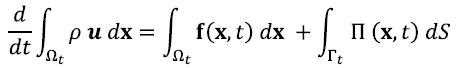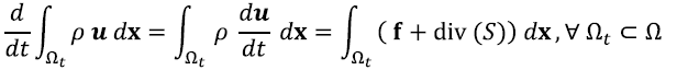 A través del teorema de Cauchy [16], que relaciona la densidad de fuerza superficial con el tensor de esfuerzo, y del teorema de Gauss [17], que bajo condiciones de continuidad permite el cambio de la integral de superficie a integral de volumen, puede escribirse la expresión integral del momentum, como: