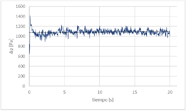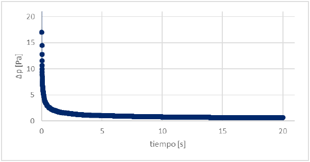 En las Figs. 3 y 4 se observa que la simulación del sistema a través de la ecuación de Navier-Stokes es más adecuada para predecir el comportamiento del flujo del fluido que con la ecuación de Stokes, ya que representa mejor la fluctuación en la diferencia de presión (despreciando las condiciones de arranque, la fluctuación se mantiene entre 900 Pa y 1250 Pa), y la diferencia de presión media es cercana a la media experimental (1000 Pa). Se observa, además, que la simulación del sistema mediante la ecuación de Stokes no es apropiada para este tipo de sistemas, ya que al despreciar el término convectivo la diferencia de presiones tiende a cero con el paso del tiempo y esto no ocurre en el sistema real.