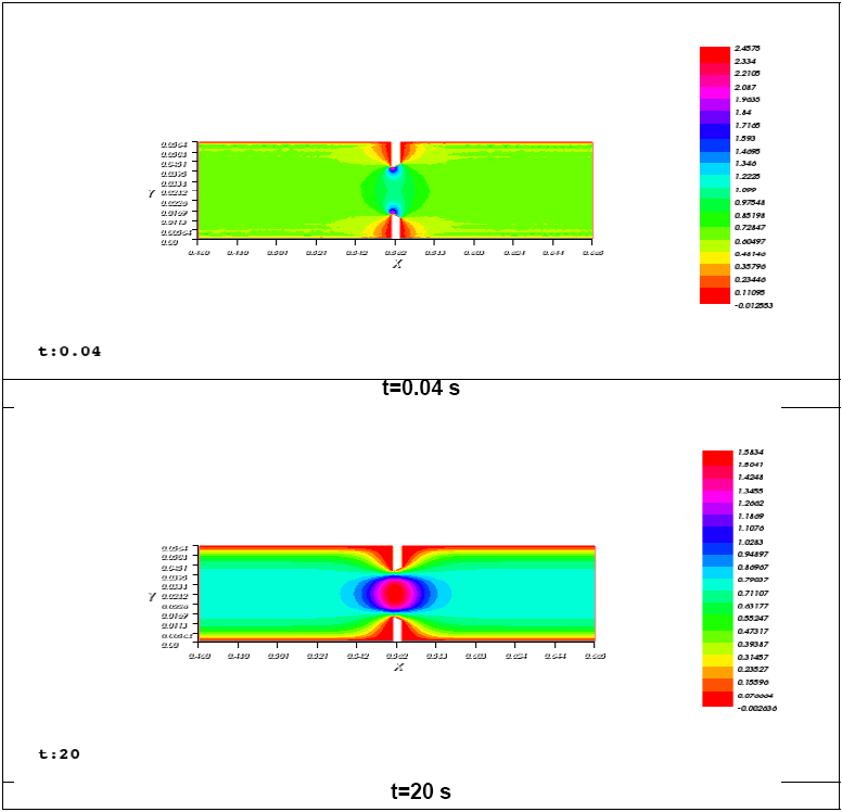 En la Fig. 6, donde se presentan las imágenes de velocidades del comportamiento del fluido bajo la ecuación Stokes en diferentes tiempos, no se observa variación del perfil de velocidad una vez se desarrolla.