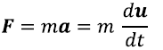La segunda ley de Newton expresa que la fuerza (F) es igual a la masa (m) por la aceleración (a), que puede expresarse como la derivada de la velocidad (u) en relación al tiempo (t).