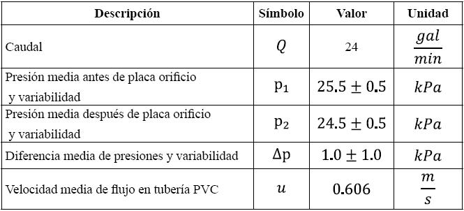 Las características de los instrumentos de medida utilizados para obtener los valores experimentales relacionados en la Tabla 2 fueron: dos manómetros de presión, marca Riester, con escala de 0 a 95 kPa, ubicados a una pulgada antes y después de la placa orificio, y un transmisor de flujo Signet 8550-1, que entrega la medida de caudal en galones por minuto.