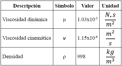 Para la simulación del sistema se tomaron en cuenta las propiedades del agua líquida a 15 °C, las cuales se describen en la Tabla 3; se tomó la gravedad estándar, g = 9.806 m/s2, y se consideró un caudal Q = 24 gal/min = 0.001514m3/s, que, teniendo en cuenta el diámetro interior de la tubería Di = 56.4mm, da una velocidad media de flujo u = 0.606m/s.