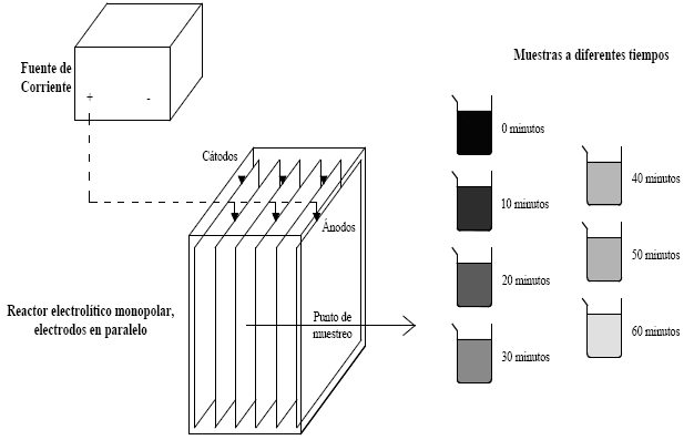 Se dispusieron los electrodos en sus posiciones dentro del reactor, se fijaron los caimanes en su parte superior y se depositó el agua que se iba a someter al tratamiento (líquido en condiciones naturales de color o con adición de las sustancias húmicas o sales), cuyo tiempo de exposición al tratamiento fue de 60 minutos.