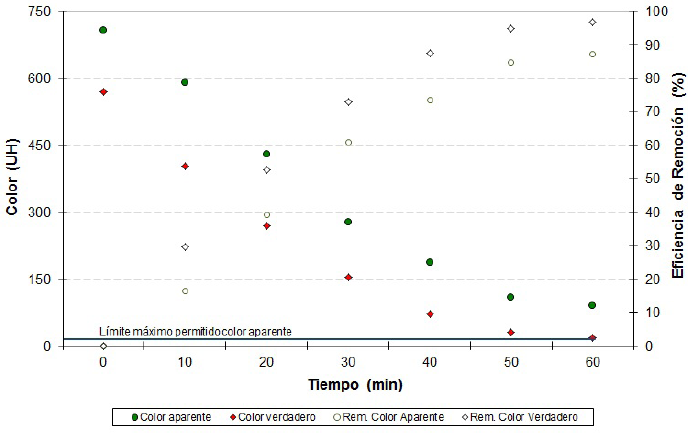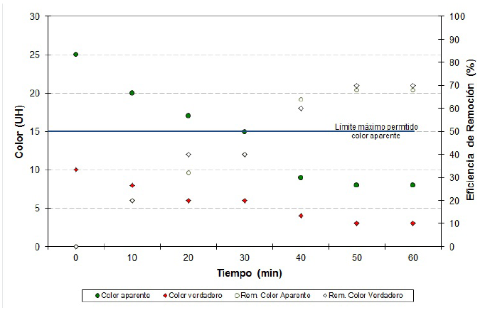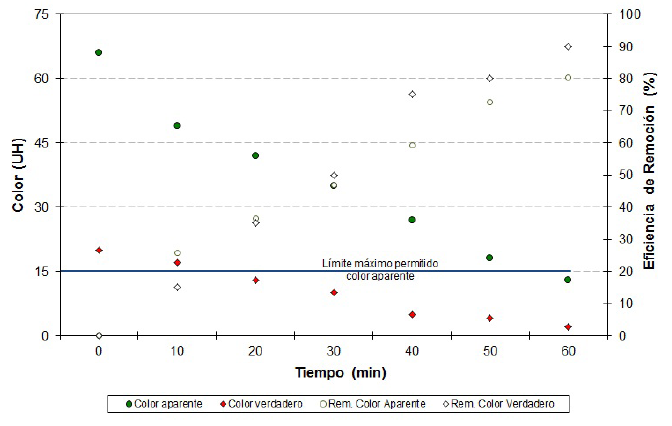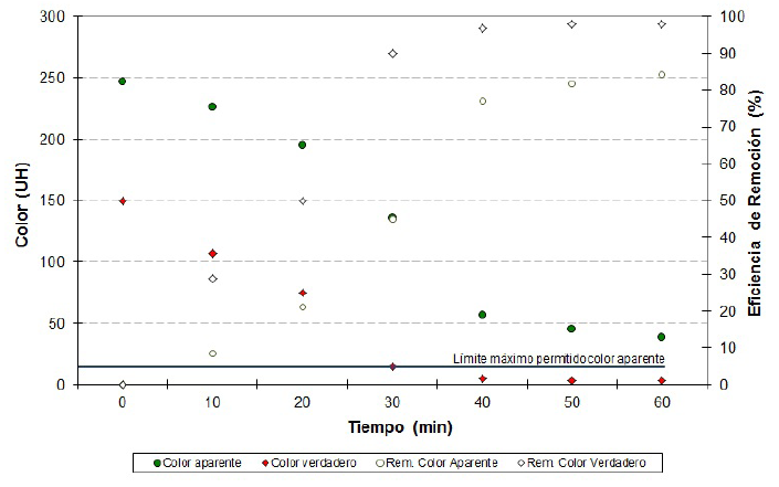 El nivel inicial de color aparente fue de 66 uH y el de color verdadero fue 20 uH; la variación de este parámetro a lo largo del tiempo de reacción, así como la progresión de la eficiencia de su remoción se representan gráficamente en la Figura 3.