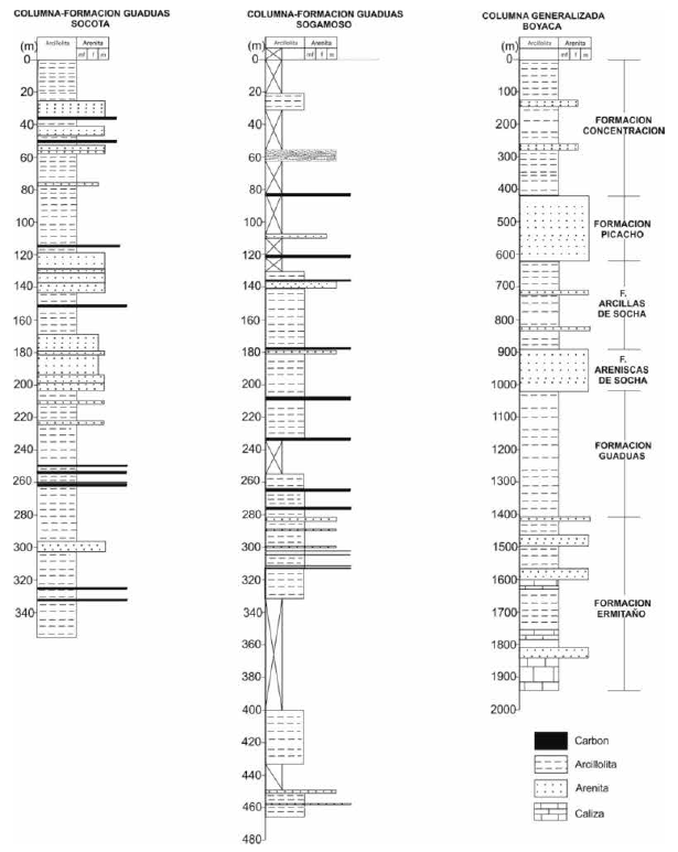 La secuencia estratigráfica presente en el área de Socotá corresponde a una sucesión de rocas sedimentarias, conformada de base a techo por: formación Ermitaño, formación Guaduas (portadora de los carbones), formación Areniscas de Socha, formación Arcillolitas de Socha, formación Picacho, formación Concentración y depósitos cuaternarios que pertenecen al reciente (Figura 2).