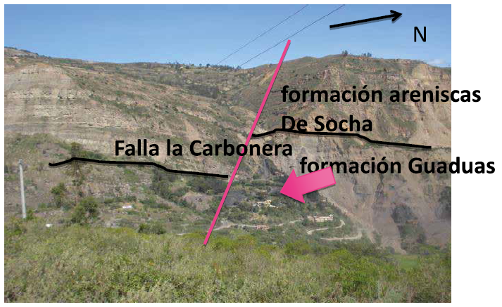 El anticlinal de Socotá es la estructura más sobresaliente del área, tiene una dirección NE-SW, sus flancos son asimétricos y se encuentra afectado por la Falla del Cómeza, en su núcleo, y por las fallas inversas, normales y direccionales, en sus flancos. La presente investigación se centró sobre el flanco occidental porque allí se concentra la minería en el área, por su buena continuidad regional. Su núcleo lo conforman rocas de la formación Ermitaño, y sus flancos, rocas de las formaciones Guaduas, areniscas de Socha Inferior y arcillolitas de Socha. En la Figura 3 se aprecian las labores de acceso o bocaminas (flecha grande) de la mina La Esperanza en la formación Guaduas. Igualmente, se aprecia el contacto neto con las areniscas de la formación areniscas de Socha, las cuales forman el escarpe típico de la peña de Socotá.