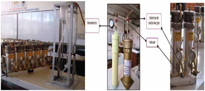 Los contenidos de gas asociados en carbón en el presente estudio están basados en métodos directos de medición, que consisten en medir la cantidad de gas que tiene una muestra de carbón mediante la desorción de núcleos de perforación con los equipos de desorción cánisters (recipientes sellados herméticamente) [7,11]. El proceso de medición comprende tres métodos diferentes, teniendo en cuenta que el contenido total de gas es la sumatoria de tres componentes, así: gas perdido + gas desorbido + gas residual [1, 9]. El gas perdido corresponde al escapado del carbón entre el tiempo en que el manto de carbón es penetrado por la broca y el tiempo en que la muestra es puesta dentro del cánister y sellado. El gas desorbido es el que está absorbido en la muestra de carbón, y se determina empleando los cánister: las muestras de carbón son introducidas en el cánister y selladas; posteriormente, este cánister es conectado a la bureta y se abre la válvula que permite la salida del gas, que es medido por el desplazamiento del agua en una columna volumétrica en la bureta a temperatura del yacimiento y presión atmosférica (Figura 4). El gas residual es el que permanece atrapado en la matriz del carbón, que no salió como gas perdido o desorbido; se obtiene pulverizando el carbón con un molino hermético adaptado a un sistema de medición de gas.