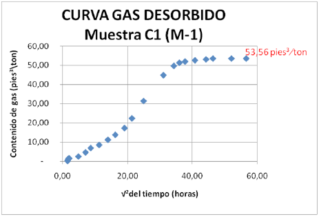 Para todas las muestras, las mediciones de desorción se hicieron, como en la Figura 5, hasta que la muestra no desorbió nada de gas por varios días y, por lo tanto, la curva acumulativa de gas se tornó horizontal [3].
