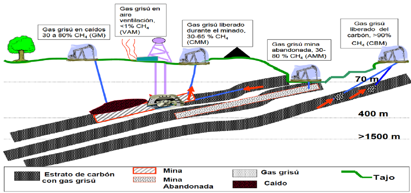 La extracción del gas grisú de las minas, o desgasificación, requiere de un complejo proceso de desgasificación, que tiene lugar antes, durante y posterior al minado. Existen cinco formas diferentes de extraer el gas de una mina:1) CBM o extracción previa al minado por perforación vertical o dirigida desde superficie en áreas vírgenes por desarrollar; 2) perforación horizontal desde el interior de la mina para extraer gas de la zona próxima al frente de explotación (CMM); 3) posterior al minado, a través de perforaciones verticales desde superficie, para extraer el gas localizado en los caídos minados o material derrumbado(GOB-GM); 4) durante el minado, por ventilación intensa de los sitios de trabajo a través de extractores mecánicos desde superficie (VAM), y 5) gas extraído de minas abandonadas (AMM). Estos métodos son ilustrados en la Figura 6.