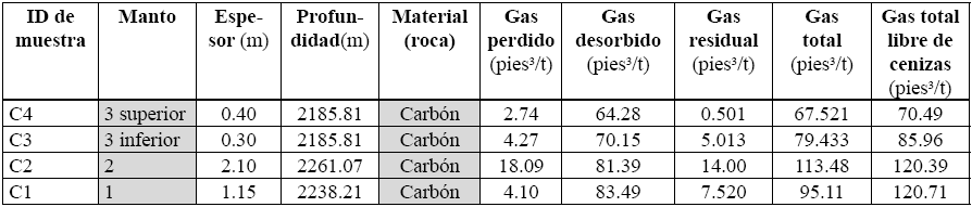 En general, las muestras analizadas tienen contenidos de gas apreciables, por el orden de los 100-200 pies³/t. Estos contenidos de gas presentan desafíos para la minería, por el riesgo de explosiones, pero, igualmente, ofrecen buenas posibilidades para aprovecharlo como recurso energético.