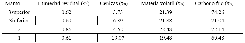 Los análisis inmediatos de las muestras tomadas en los frentes de mina (Tabla 2) permiten hacer la corrección por contenido de cenizas y humedad, lo que eleva ligeramente el contenido de gas en la última columna de las Tablas 1 y 3.