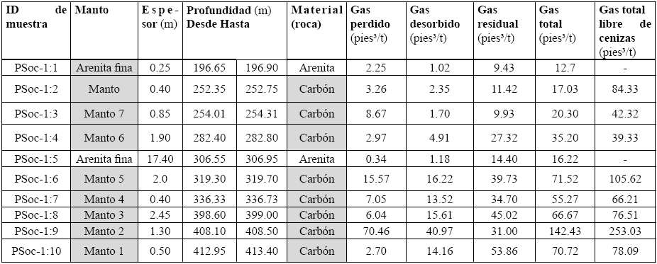 La Tabla 3, del Pozo Socotá 1, presenta los valores de gas total, que fluctuaron entre 12 y 142 pies³/t, con un promedio de 50 pies3/t. Se notó un ligero incremento en el contenido de gas con la profundidad. Los mantos con mayor contenido son el 2 (muestra 9 a 408 m de profundidad), con 142.42 pies³/t, y el 5 (muestra 6 a 319 m de profundidad), con 71.52 pies3/t. Después de las correcciones por ceniza y humedad, los contenidos de gas se incrementaron entre 23 % y 36 %, respectivamente. Ese incremento se debe, principalmente, a que los valores de gas perdido de los contenidos son altos; por ejemplo, el gas perdido en la muestra 9 es de 70,46 pies³/t, lo que es inusualmente alto. Por lo anterior, los valores totales libres de cenizas se incrementaron en las muestras de diferente forma, dependiendo del contenido de ceniza. Los mayores valores se encontraron en los mantos 2 y 5, con 253 y 105 pies³/t, respectivamente.