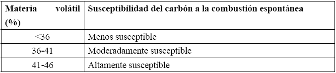 La combustión espontánea es más probable en carbones de bajo rango, como los lignitos y los sub-bituminosos. Hay una relación directa entre la susceptibilidad del carbón a la combustión espontánea y la materia volátil [8]; en términos generales, entre mayor sea el porcentaje de materia volátil, mayor será la susceptibilidad del carbón a la combustión espontánea (ver Tabla 4).Los carbones del sector de Socha-Socotá se clasifican como bituminosos medios a bajos en volátiles, con características coquizables, y sus valores de materia volátil, que están alrededor del 20%, los ubica dentro del rango de menor susceptibilidad (baja) a la combustión espontánea (ver las Tablas 2 y 4).