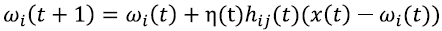 where ωi(t) are weights of the map, η(t) is a learning coefficient, hij(t) is a neighborhood function, and x(t) is the input vector.