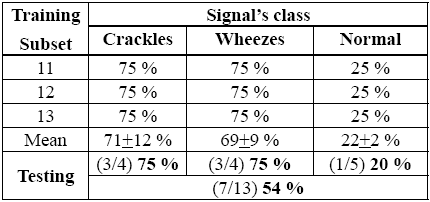Results from the testing test are shown as number of hits out of number of maps for each class obtained through LOO technique. In summary, crackles cluster had 75 %, Wheezes 75 % and Normal 20 % of classification accuracy. In general, these results had 54 % of classification accuracy.