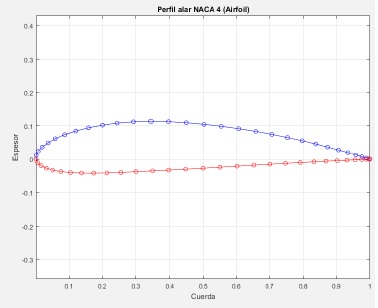 Figure 6 shows the 4-digit NACA airfoil developed with the NACA 4-digit airfoil generator [9,13]. This airfoil is useful for wind power applications, because they are not only about the air particles impacting the blade, but about taking advantage of the lift phenomenon to make the propeller move, as we explained above. This type of airfoil has acceptable efficiency and rigidity features, and is easy to construct, which makes it an excellent choice for horizontal axis wind turbines [11].