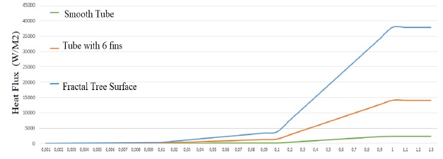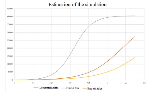 The results obtained lead us to conclude that implementing fractal tree as an extended surface in tubes arranged for heat exchangers allows a greater transfer of heat between the fluid in the inside and the outside of the tube. The evaluated extended surface increases the contact surface and expands the edges of the extended surface, which facilitates the heat exchange, because it improves the turbulence of the fluid and thus the transfer of heat.