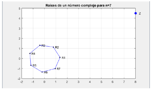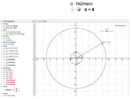 Roots of a complex number: In order to find the root of a complex number in GeoGebra, it is necessary to download an application that is available in the official GeoGebra web page (raices.ggb). After downloading the file, we opened GeoGebra, which comes with a predetermined data in the algebraic view. All values can be modified, but to obtain the result we should simply modify the complex number "A" and the value of "n" (Fig. 8).