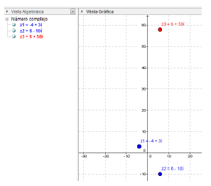 Operations between complex numbers: To perform operations between complex numbers, GeoGebra allows representing them also in the plane [12]. We enter the two or more numbers to be operated and then declare a as the result of the operation. Results of the multiplication are shown in Fig. 5, and the division in Fig. 6