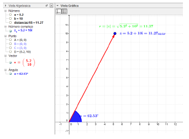 Polar form of a complex number: To represent a complex number of polar form (Fig. 9), it is necessary to download an application called complex number polar and trigonometric, which is found in the official webpage of GeoGebra. Once the .ggb file has been downloaded it can be opened in GeoGebra. The program comes with a predetermined data in the algebraic view. All the values can be modified, although to obtain the result, we simply modify the complex number.