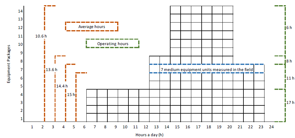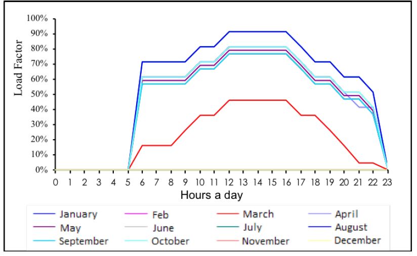 The plant also has 14 package units of 25 tons of refrigeration (TR) each that supply air-conditioning to the entire warehouse; this is mainly used during summer when ambient temperatures increase. This equipment is activated in staggered phases throughout the day. The first four equipment packages are activated at 6:00 a.m., then, four more are activated at 12 p.m., and the six remaining are turned on at 2:00 p.m. Seven of them are turned off at 8:00 p.m., and the rest, at 11:00 p.m. (Fig. 1). This takes place during the eight-month season that is considered to have high ambient temperatures, which lasts from March to October. All the equipment operates for an average of 10.6 hours a day; however, the first four equipment units operate a total of 17 hours a day, experiencing greater wear, which reduces their lifespan compared to the rest of the equipment. Regarding the lights, the evaluation showed that they are in good condition and do not need changes or modifications.