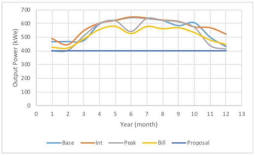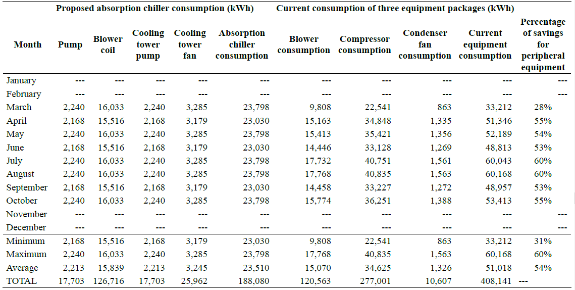 By implementing this cogeneration system, an average monthly electrical energy savings of 234,786 kWh will be achieved with the additional benefit of 29,804 kWh in surplus energy per month, which could be exported at the DAC rate at the cost of 10% less than its billing price. In addition, an average monthly savings of 372 kW for billable demand would be obtained (Fig. 3). Concurrently, there will be a 155 m3 increase of ice water in the cooling tower per month with the installation of the absorption chiller. Table 8 shows the peripheral equipment consumption for each air-conditioning system along with the savings that would be gained thanks to the change in technology.