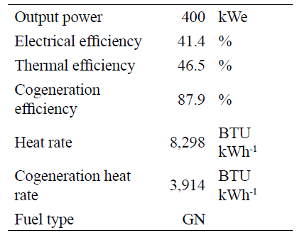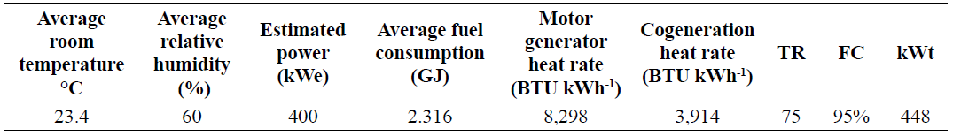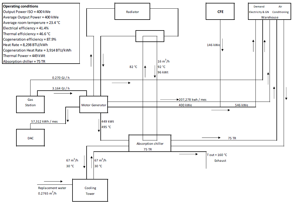 The proposal entails generating electrical energy with a motor generator powered by natural gas (Tables 6 and 7) and, at the same time, using the residual heat from gas exhaust and exhaust sleeves to produce air-conditioning with an absorption cooling system of lithium bromide-water (H2O-LiBr) as a working fluid, presenting a cooling capacity of 75 TR (commercial equipment).