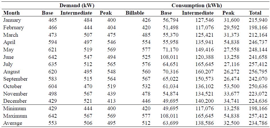 The plant has a contract with CFE for a mediumvoltage rate (HM) with a supply of 13,200 V. It has two 350 kW generators, which generate electrical energy during peak hours and serve as backup equipment in case of outages. Table 1 shows the electrical energy consumption and maximum demands of the studied plant.