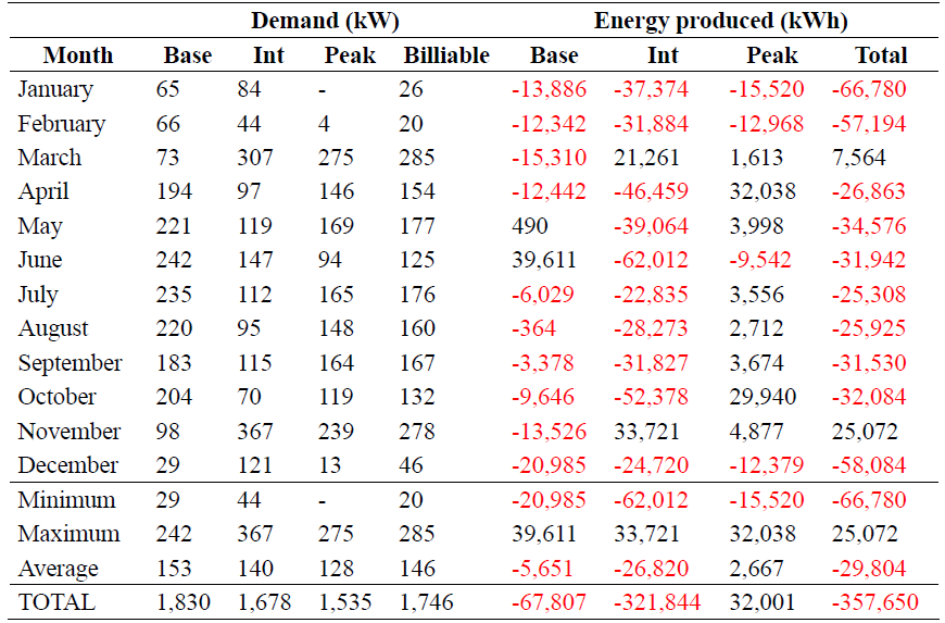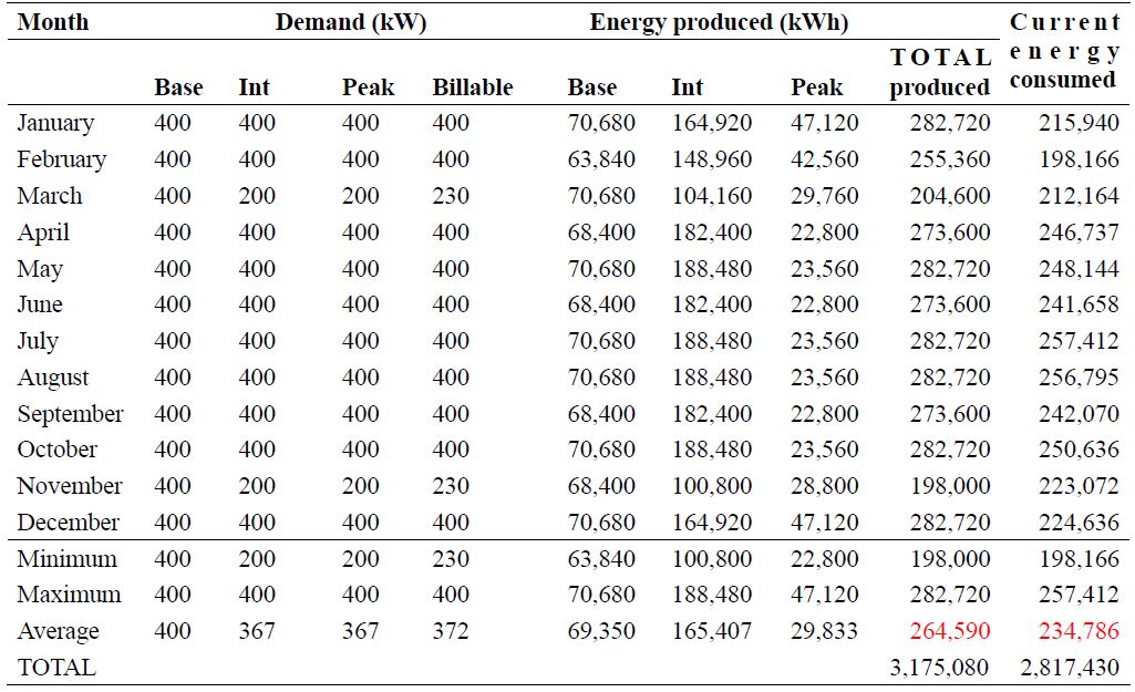 Regarding the energetic performance of the motor generator, it was observed that the total energy produced per year is higher than the energy that is currently consumed (Table 9). However, the demands (base, intermediate, and peak) of the warehouse (kWe) are higher than the installed capacity that has been proposed (Table 10). In this case, the lacking demand would be supplied by CFE.