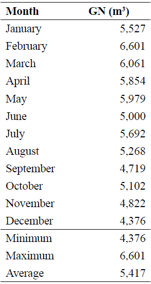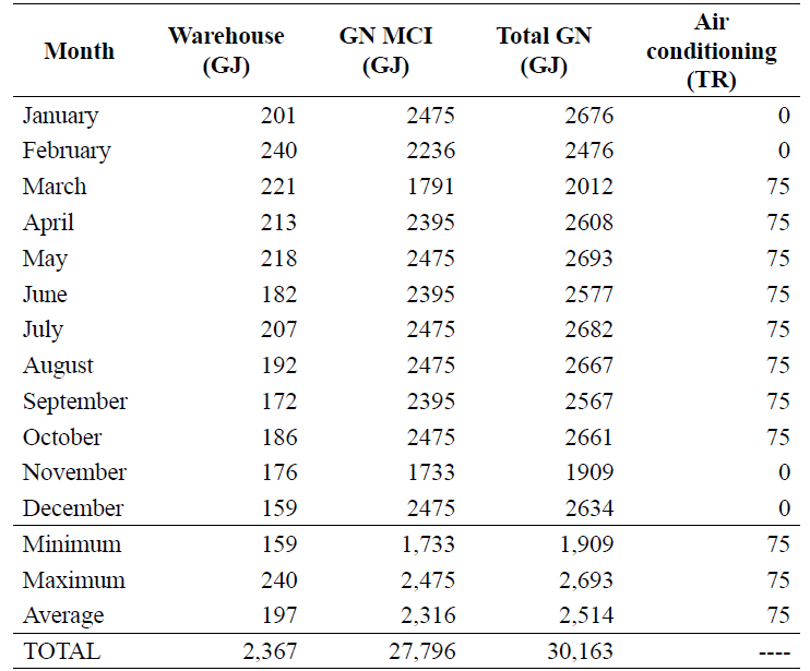 The studied company uses natural gas, with an rates average calorific value of 36,421 kJ m-3 and a supply pressure of 2 kg cm-2. Natural gas is used at these in different areas of the warehouse (Table 5).