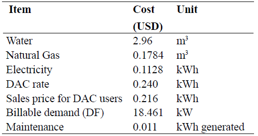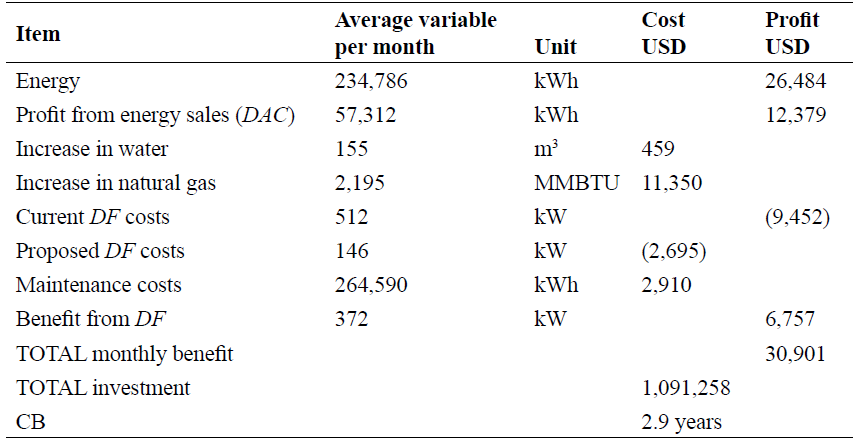 When assessing the consumption and savings according to the proposal, we considered the increase in water consumption (459 USD per month) and natural gas (11,350 USD per month). Furthermore, changing air-conditioning technology generates savings in energy consumption (27,508 kWh per month), which should be added to the surplus of electrical energy (29,804 kWh per month). The per item DF savings should be considered as the average monthly capacity of the motor generator (372 kW), with an average remaining billable demand deficit of 146 kW per month to be paid (Table 14).